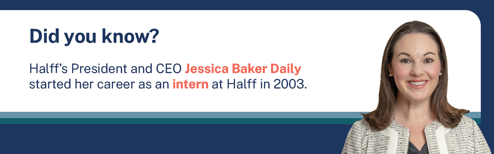 That belief is reflected at the highest level of the firm. Jessica Baker Daily, Halff’s President and CEO, began her career as an intern in 2003. Her path from student to firm leadership underscores how our culture is built on mentorship, opportunity and long-term growth every step of the way.